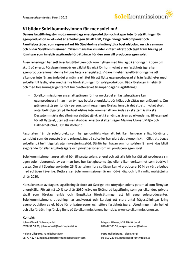 Alla ska kunna producera solel – oberoende av var man bor, hur fastigheten ägs eller vilken verksamhet som bedrivs där. Det anser HSB, Telge Energi, Solkompaniet och Familjebostäder som nu bildar Solelkommissionen. Målsättningen är att egenproducerad solel till 2030 ska stå för 10 procent av Sveriges elbehov. För att nå dit krävs förändrad lagstiftning med bättre förutsättningar för egen solel.