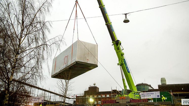 Tidigt i morse lyftes de första kubikmeterna av HSB Living Lab upp till Deltaparken på Chalmers i Göteborg. Det är startskottet för byggandet av landets första forskningshus i modulform.