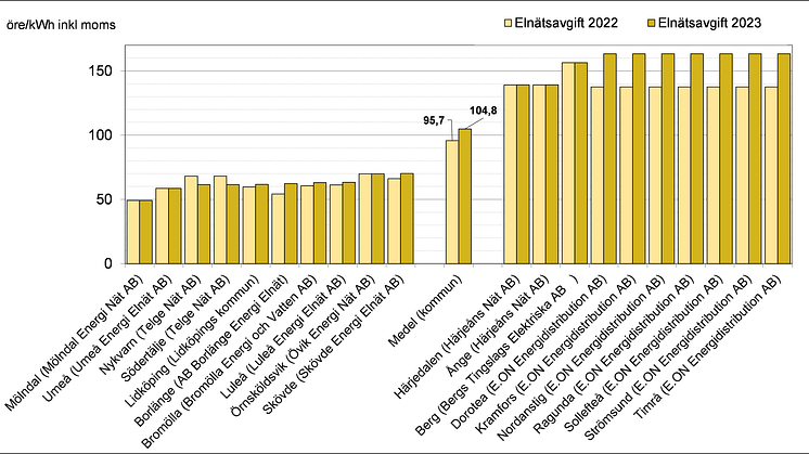 Figurerna nedan visar elnätsavgifter för billigaste och dyraste kommunerna i Sverige samt de kommuner där prisförändringen varit som störst