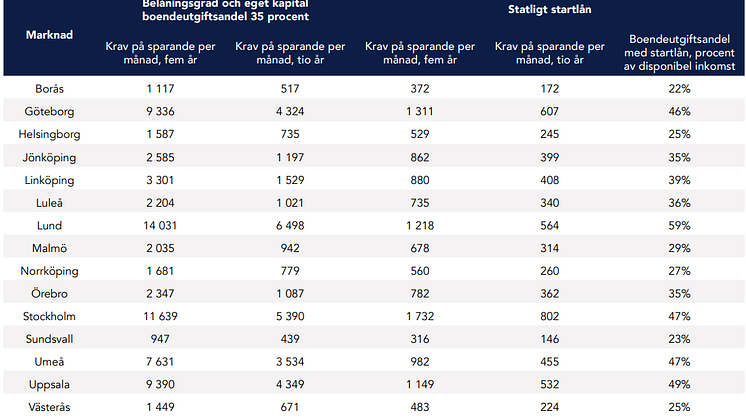 Storstäderna ligger i toppen av listan, där det krävs att en ung vuxen i Stockholm lägger undan hela 11 639 kr i månaden i fem år för att få ihop till den summa som krävs enligt det nuvarande bolånetaket och krav på eget kapital. Stockholm följs tätt av Uppsala (9 390 kr/mån) och Göteborg (9 336 kr/mån).