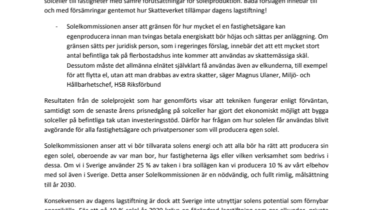 Konsekvensen av dagens lagstiftning är dock att Sverige inte utnyttjar solens potential som förnybar energikälla. För att nå 10 % solel år 2030 krävs en förändrad lagstiftning som ger elkunder, privata såväl som företag, enkla och långsiktiga förutsättningar att bli egna solelproducenter. Solelkommissionens utredning har analyserat och kartlagt ett stort antal frågeställningar kring egenproduktion av el, både för privatpersoner och större fastighetsägare. Utredningen i sin helhet och alla förbättringsförslag finns på Solelkommissionens hemsida www.solelkommissionen.se.